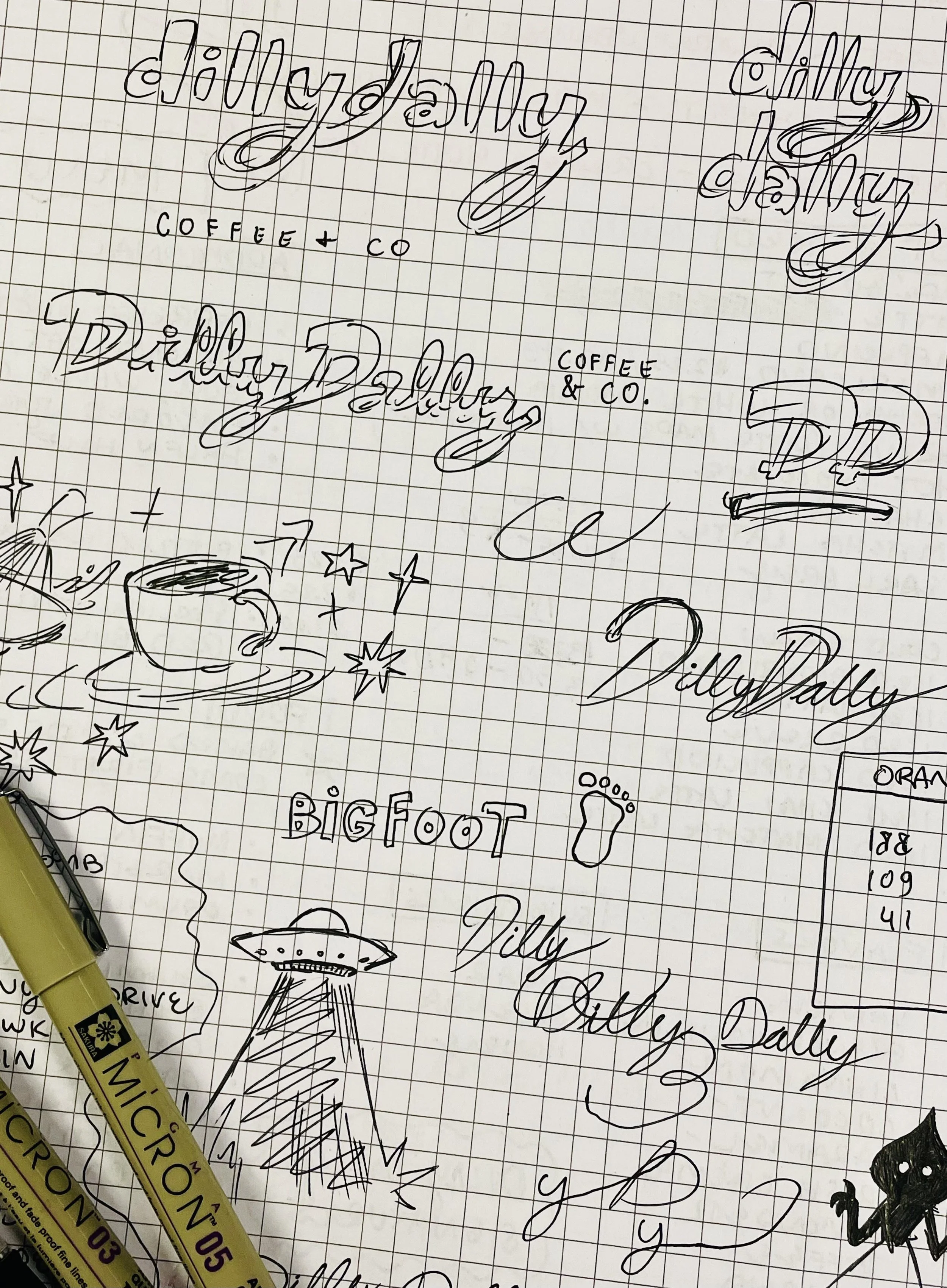 Before starting most projects, my first step is typically mood board. For Dilly Dally, I knew I wanted a crunchy coffee shop tucked away in the mountains, though the requirements of this project would cause me to upscale a bit from my humble, initial intentions. I was also inspired by retro mascots and typographic choices.