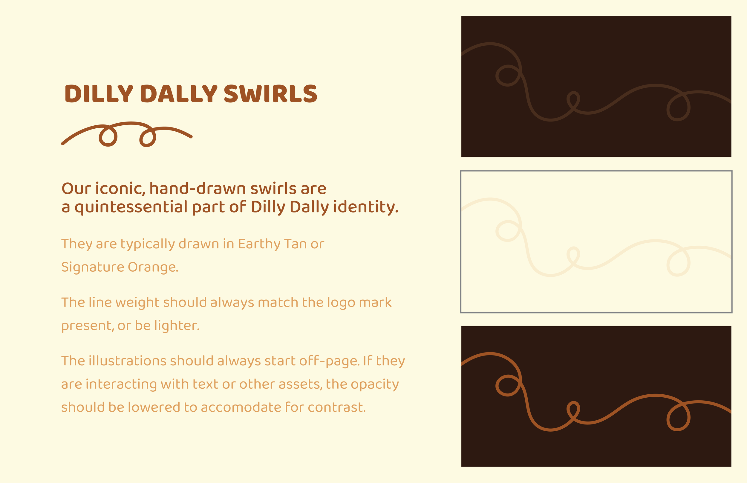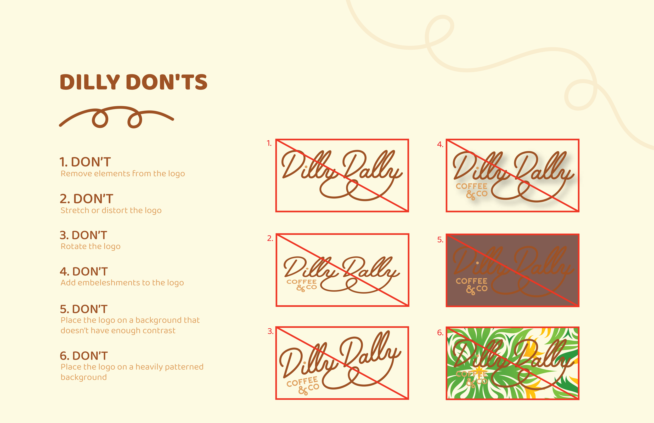 Description: For this project, we were to create a fictional restaurant and develop its logo, brand identity, a style guide, and appropriate collateral. I chose to brand a small, crunchy coffee shop known as “Dilly Dally Coffee & Co.” I utilized warm, earthy colors, playful illustrative textures, and soft typographic choices to bring this establishment to life. I had fun considering how my brand identity would appear across a variety of collateral, and thinking about how hypothetical customers would interact and respond with each component.