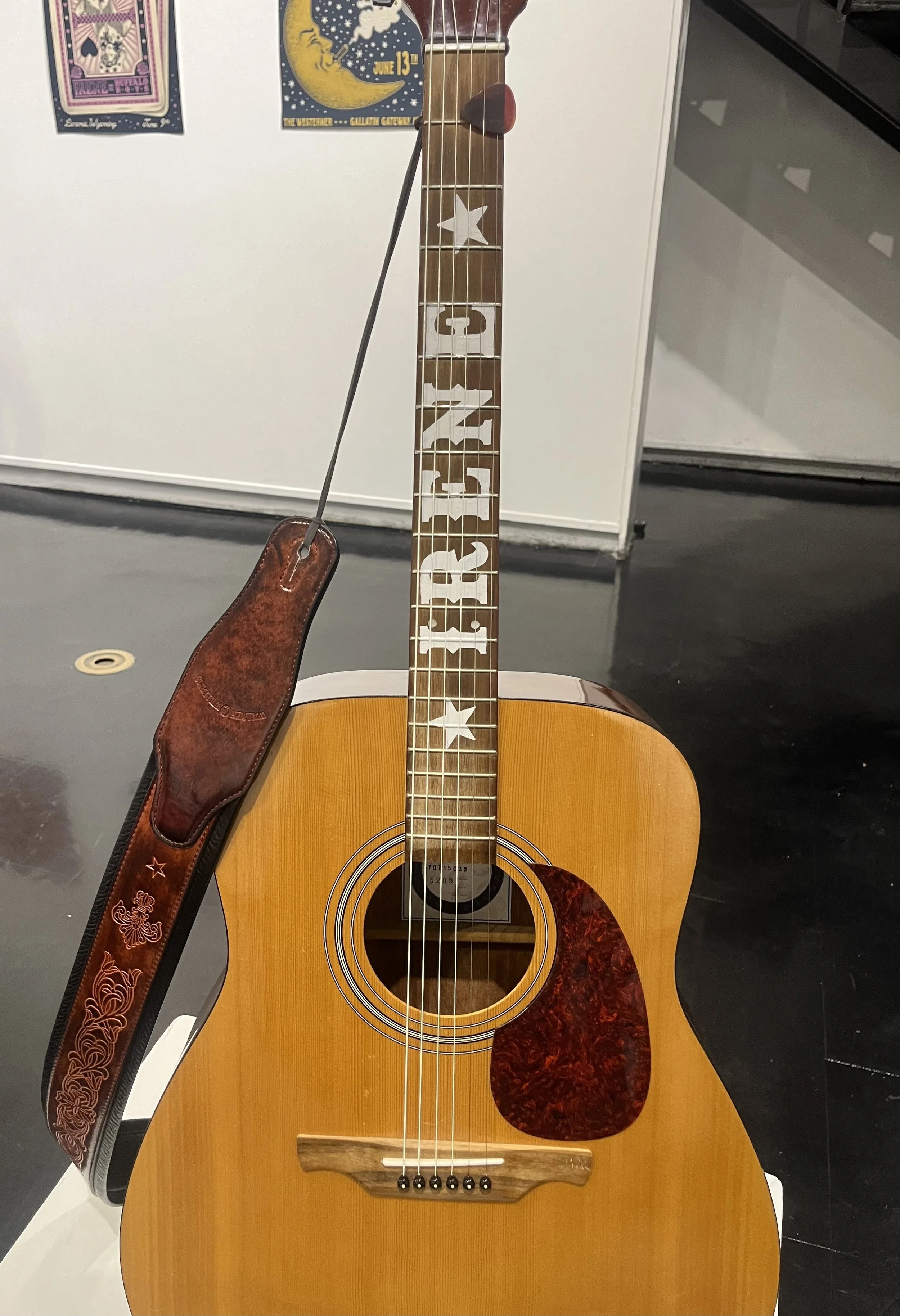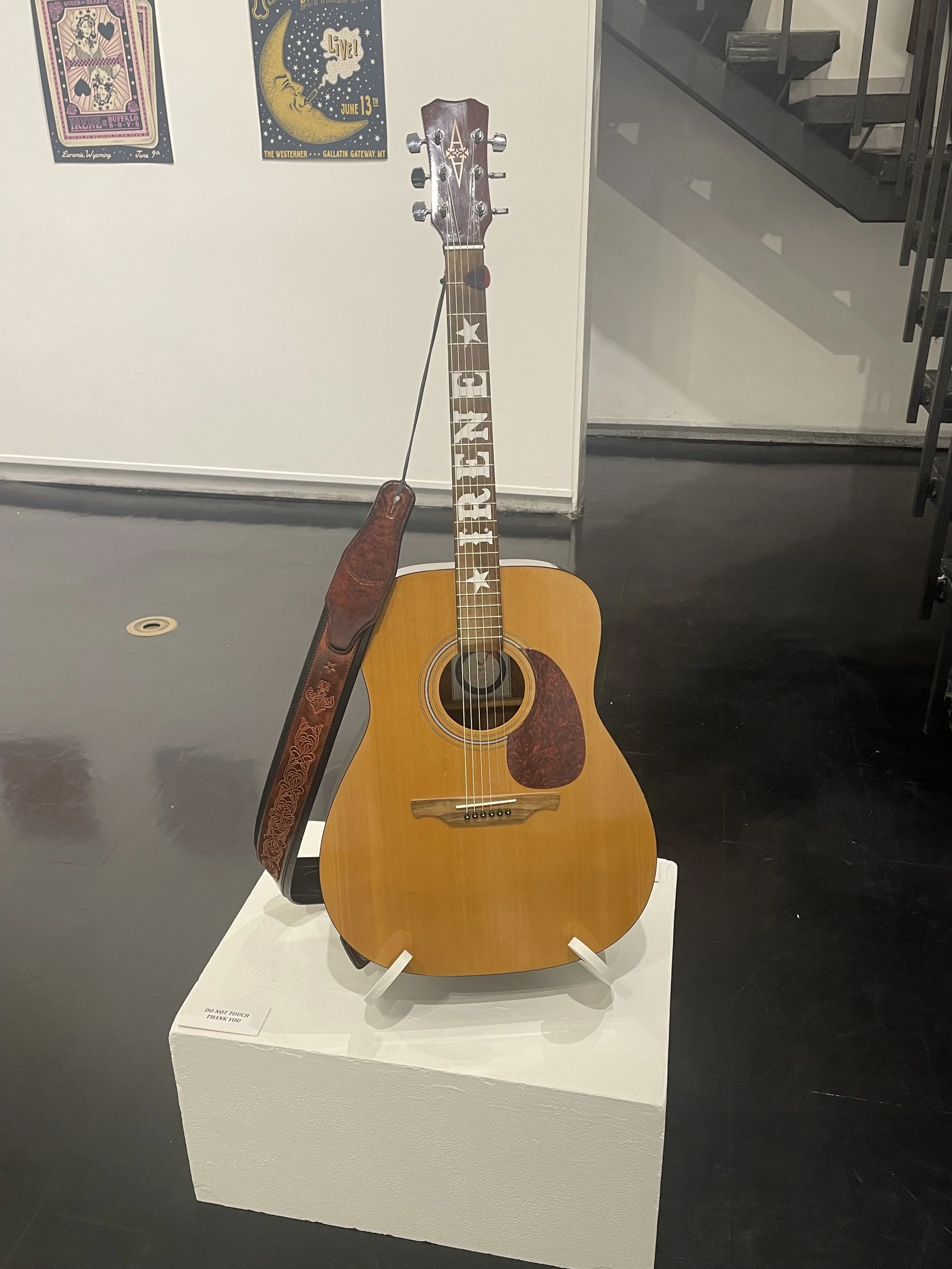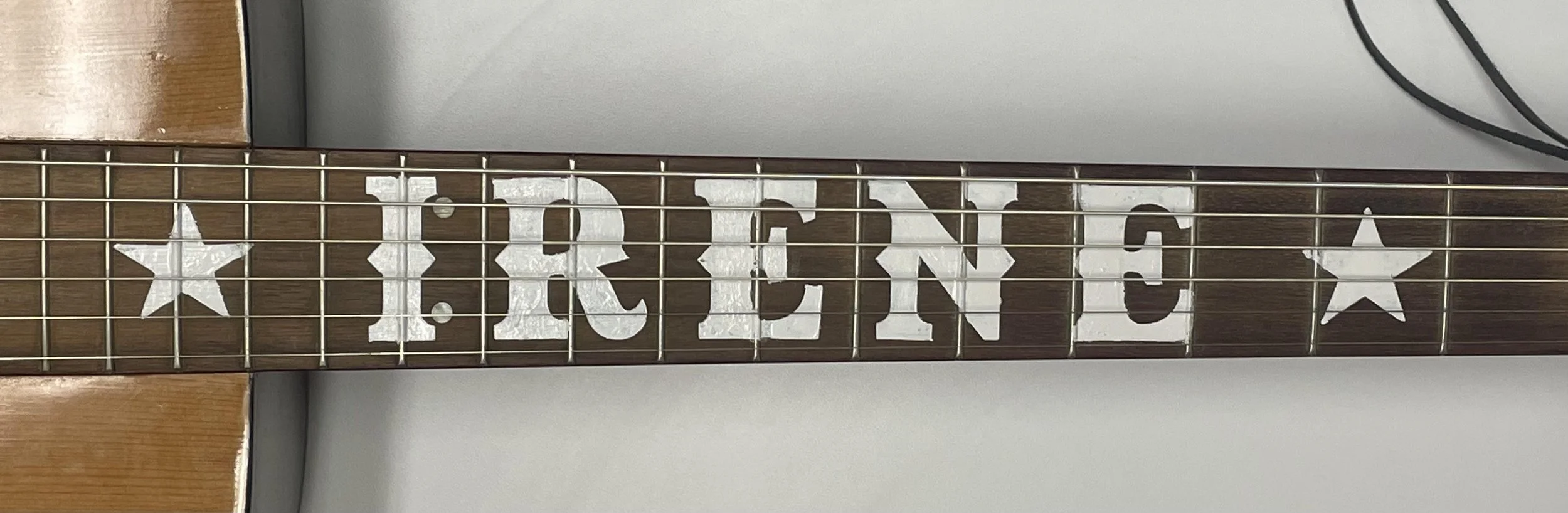 I was really inspired by the personalized fretboards of the guitars of old country singers. Therefore, I wanted to bring that into my exhibit to give Irene more depth. I created a stencil out of vinyl and used sign paint to embellish the fretboard.