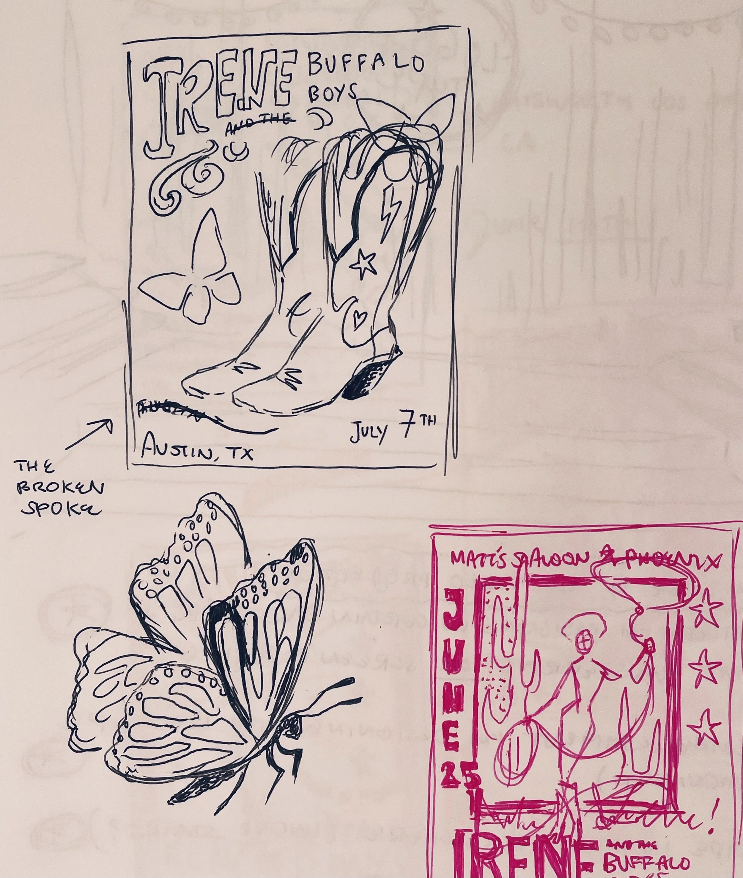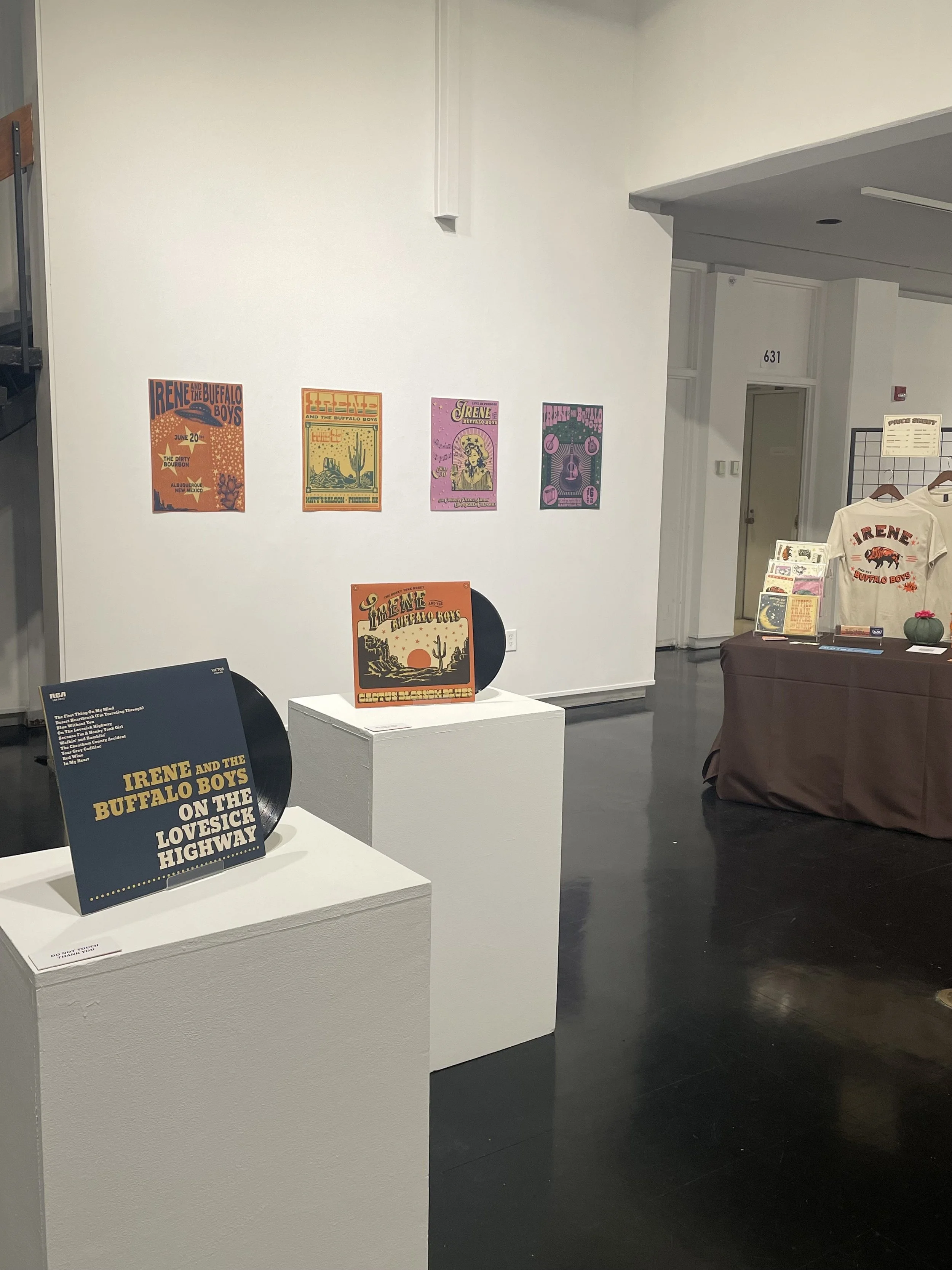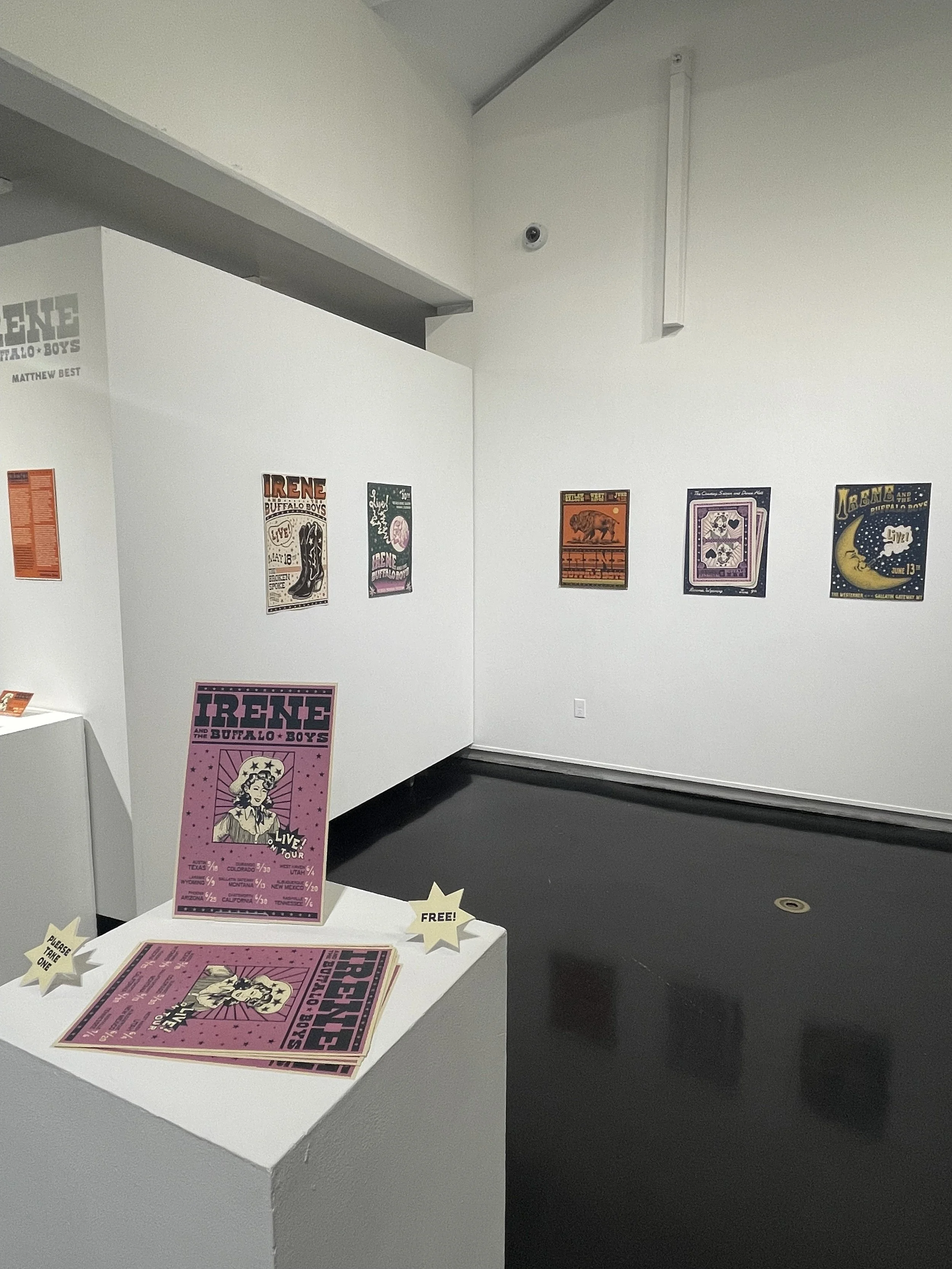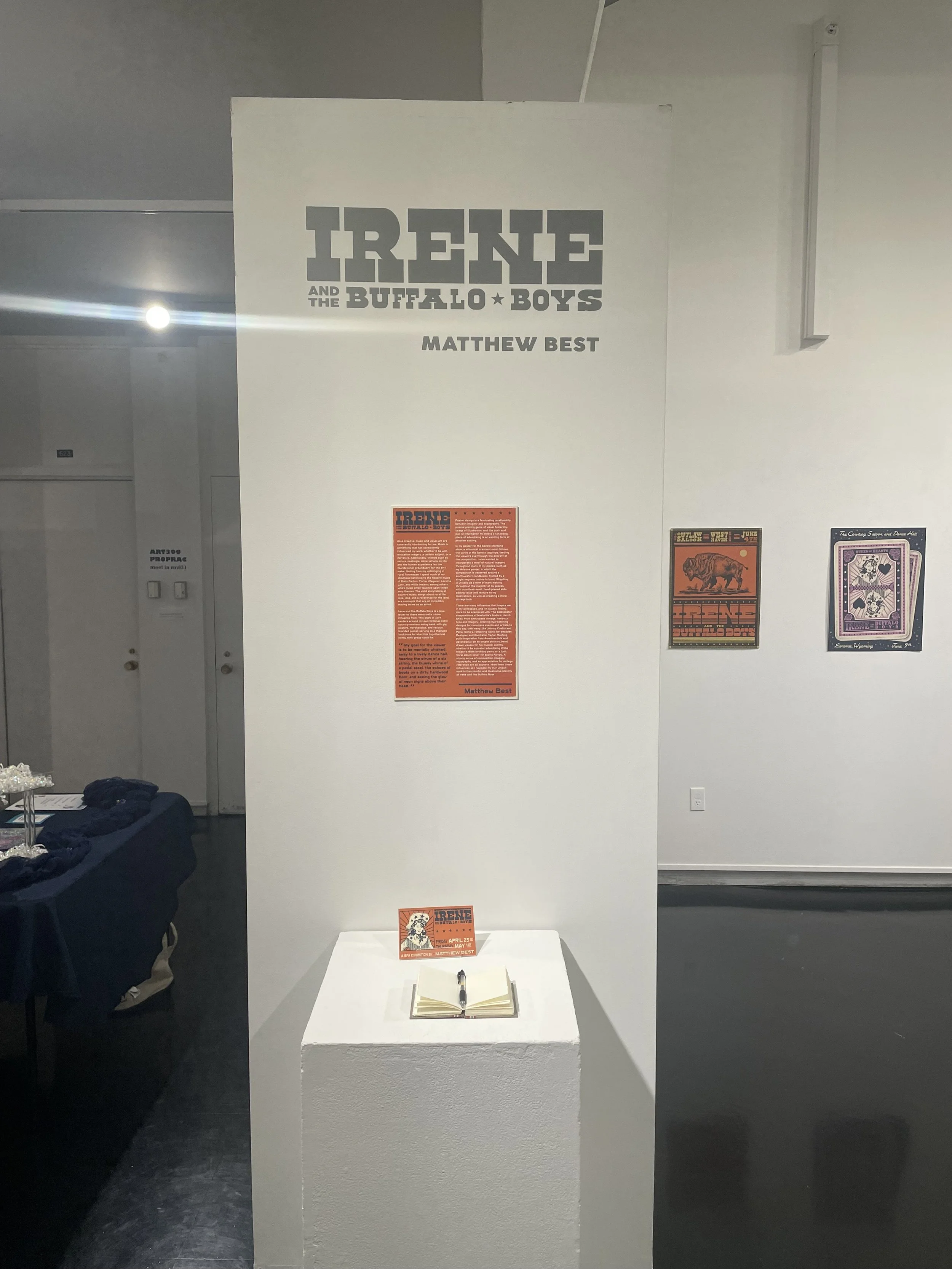 Description: My senior thesis, Irene and the Buffalo Boys, centers around my own fictional country-western swing band, with gig posters, merchandise, and various branded pieces serving as a thematic backbone for what this honk-tonk group could be. As this was to be exhibited in a gallery space, I wanted to create a fun, interactive, and memorable experience that blended bold colors, tasteful typography, fun illustrations, and engaging experiences for the viewer; a culmination of my abilities, my influences, and music that I love.