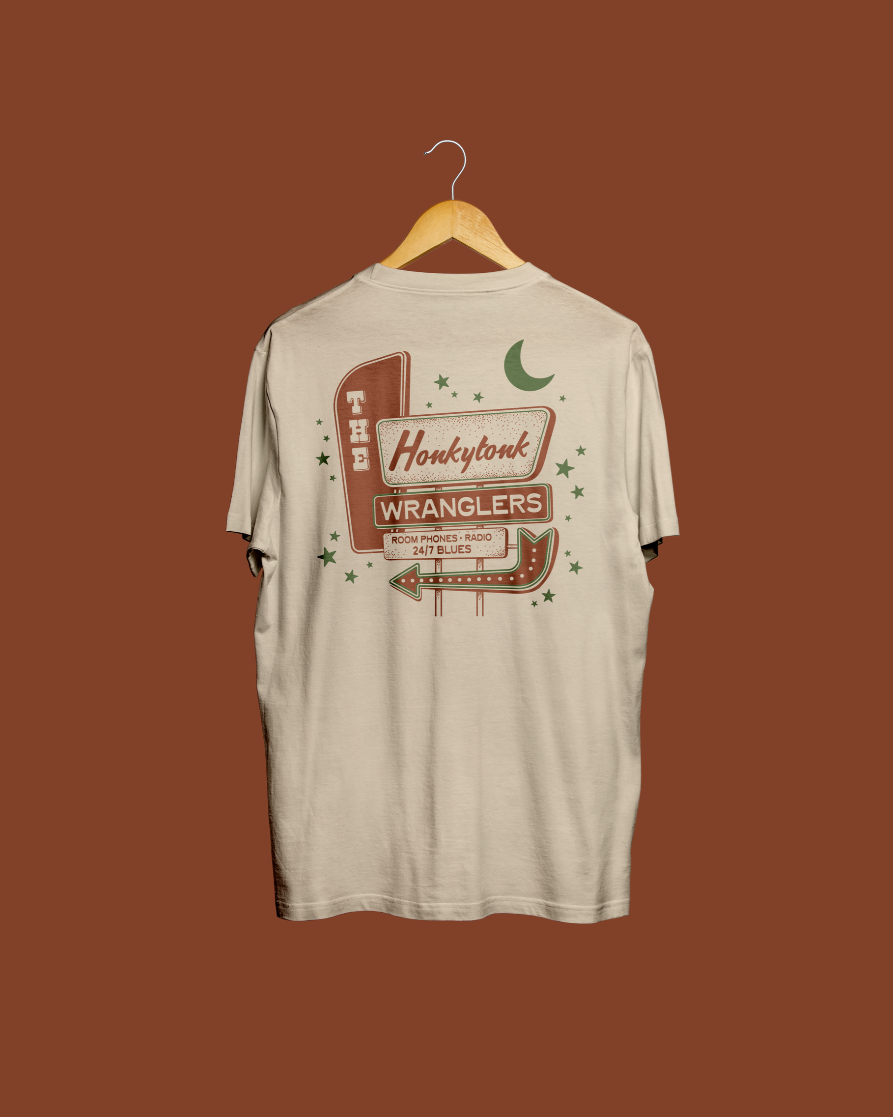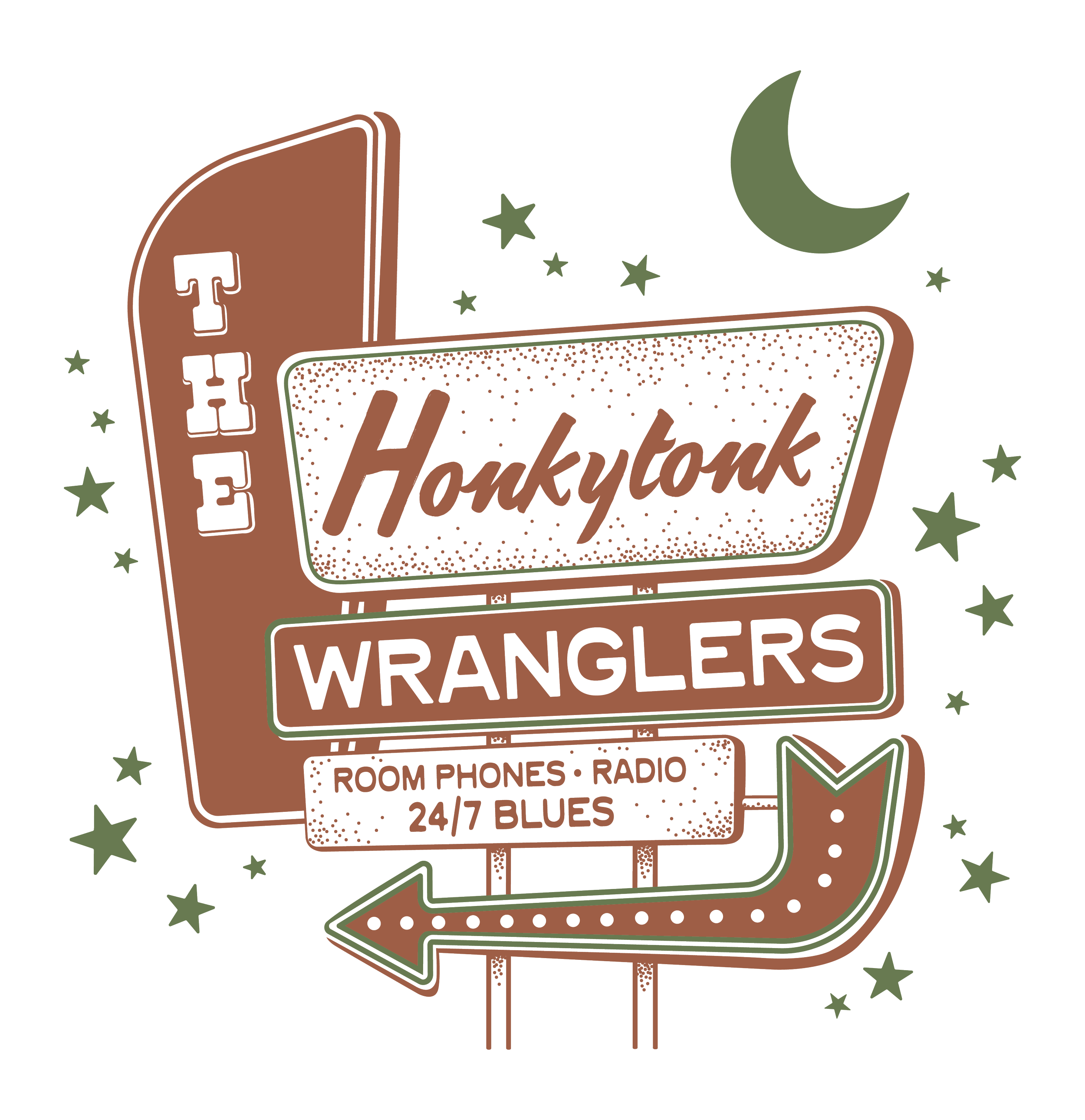 Description: Within this two-color shirt design for The Honkytonk Wranglers, I illustrated a classic image of a vintage-inspired neon motel sign to complement the band’s bluesy, classic country sound. I illustrated the assets, separated the colors, and prepped the front and back designs to be screen printed.